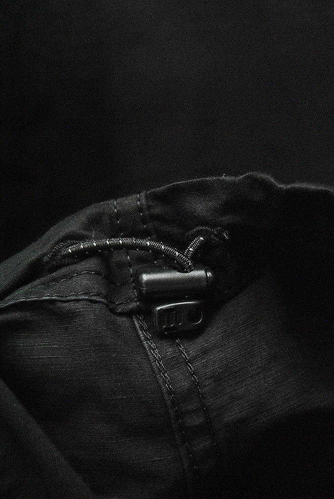 ウエストベルト付きで裾はドローコードで絞ることも可能。