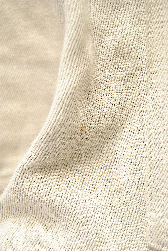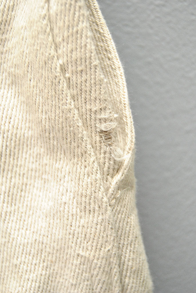 全体的に薄く汚れが見られます。ヒップ部分にシミ汚れ、裾・ポケット横部分にダメージがございます。