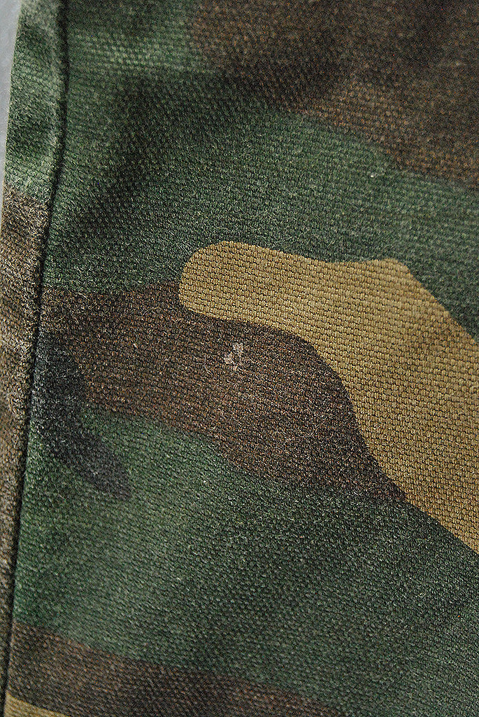 ウッドランドカモを顔料プリントしたオリジナルファブリックを採用。コットン100%のオックスフォード生地です。