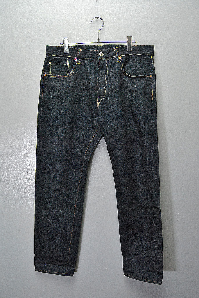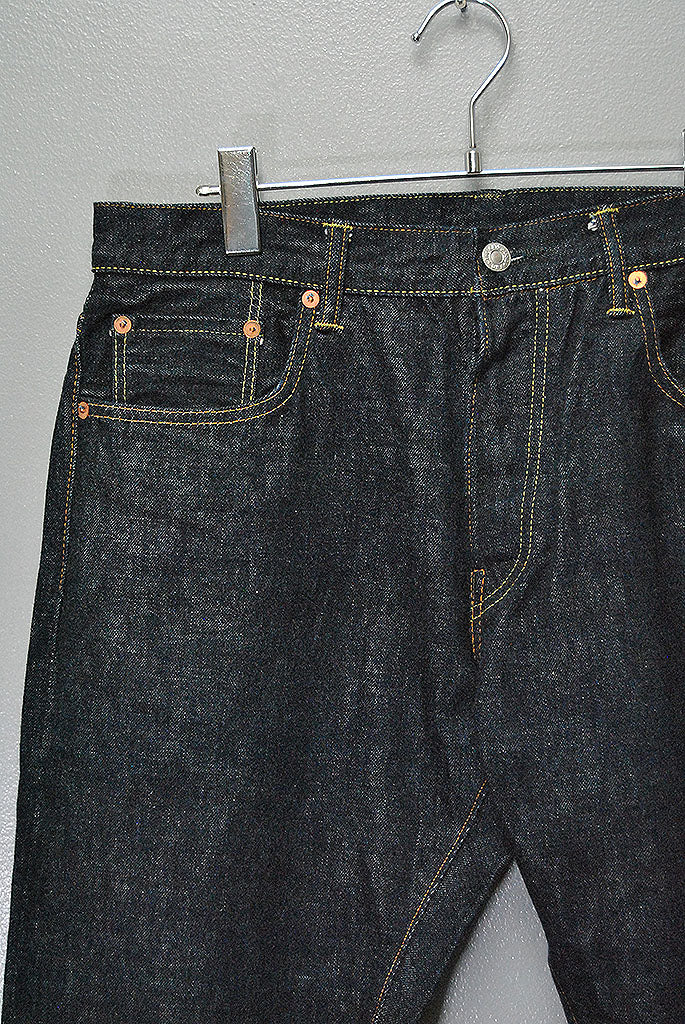 ボタンフライ、赤耳、裾はチェーンステッチが施されています。